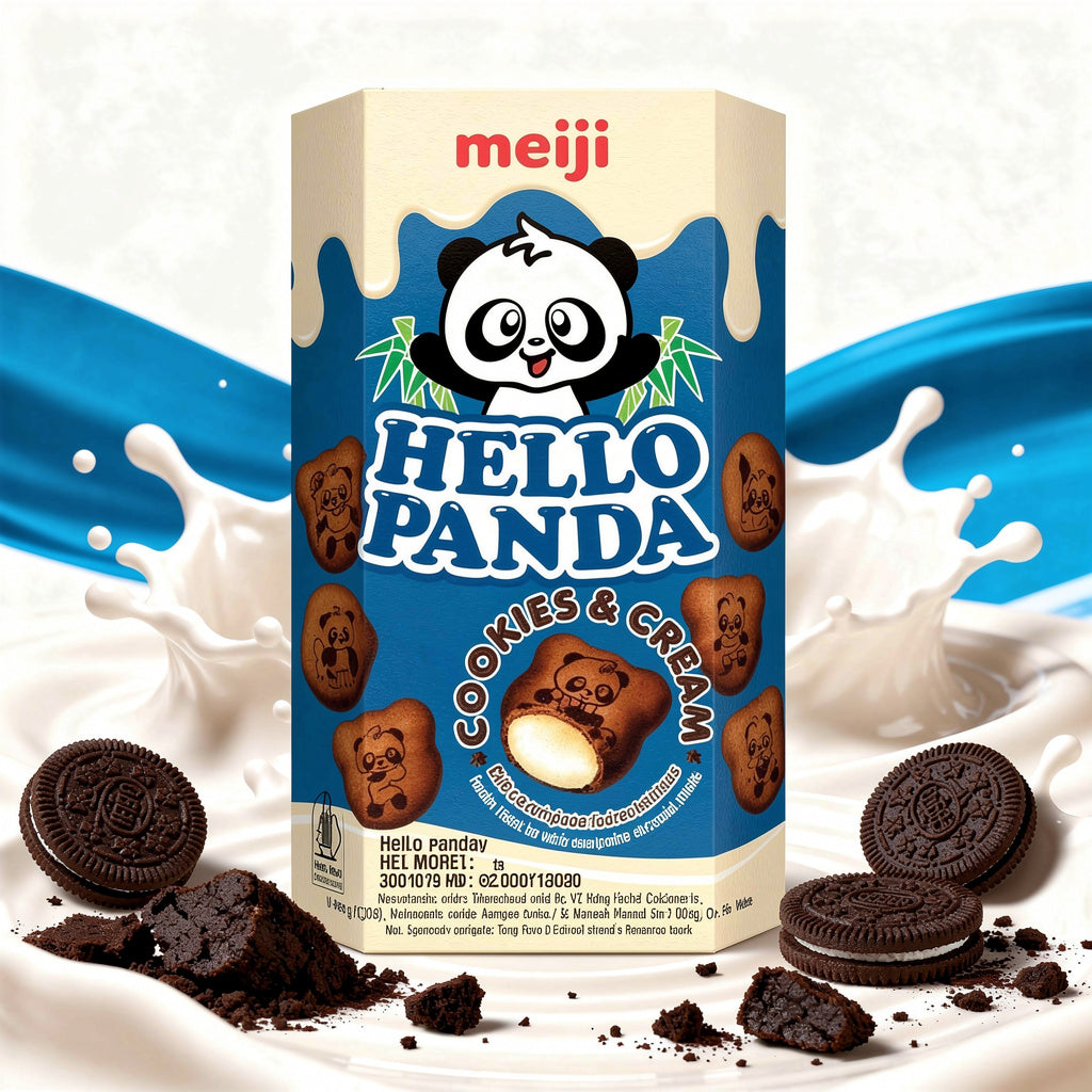 Meiji Hello Panda Cookie & Cream est un biscuit japonais croustillant en forme de panda, fourré d’une crème douce au goût cookie & cream. Ludique et gourmand, il associe un biscuit léger à un cœur fondant aux notes de vanille et de cacao. Un snack emblématique du Japon, idéal pour une pause sucrée originale et réconfortante.